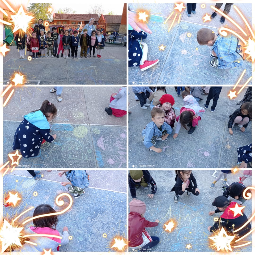29.04.2021В детском саду №3"Ирс"дошкольные педагоги провели акцию «В каждом рисунке солнце!», приурочив ее к международному Дню солидарности трудящихся. Дошкольники писали на асфальте первомайские лозунги и рисовали картины мирной счастливой жизни.